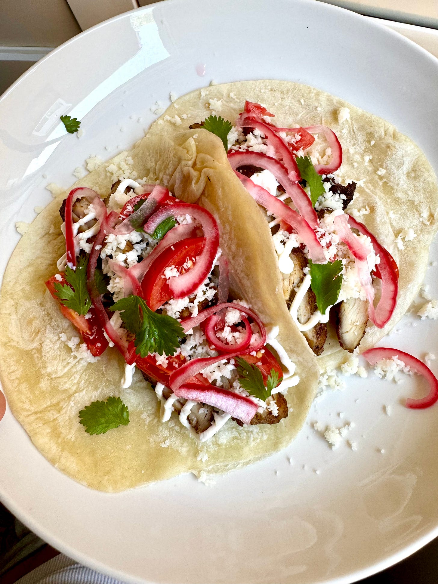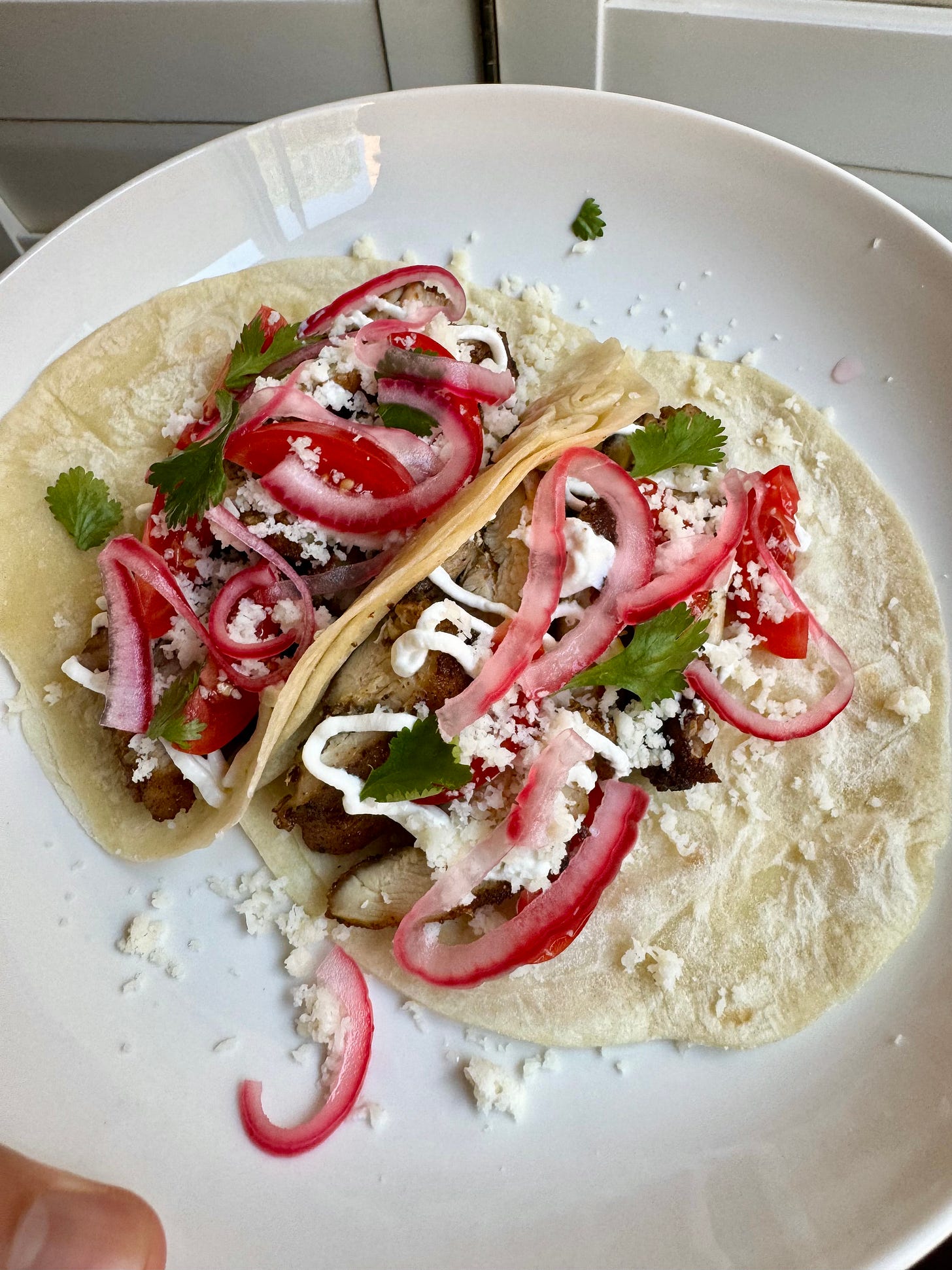 My Go-To Adobo Chicken Tacos w/ Pickled Onions